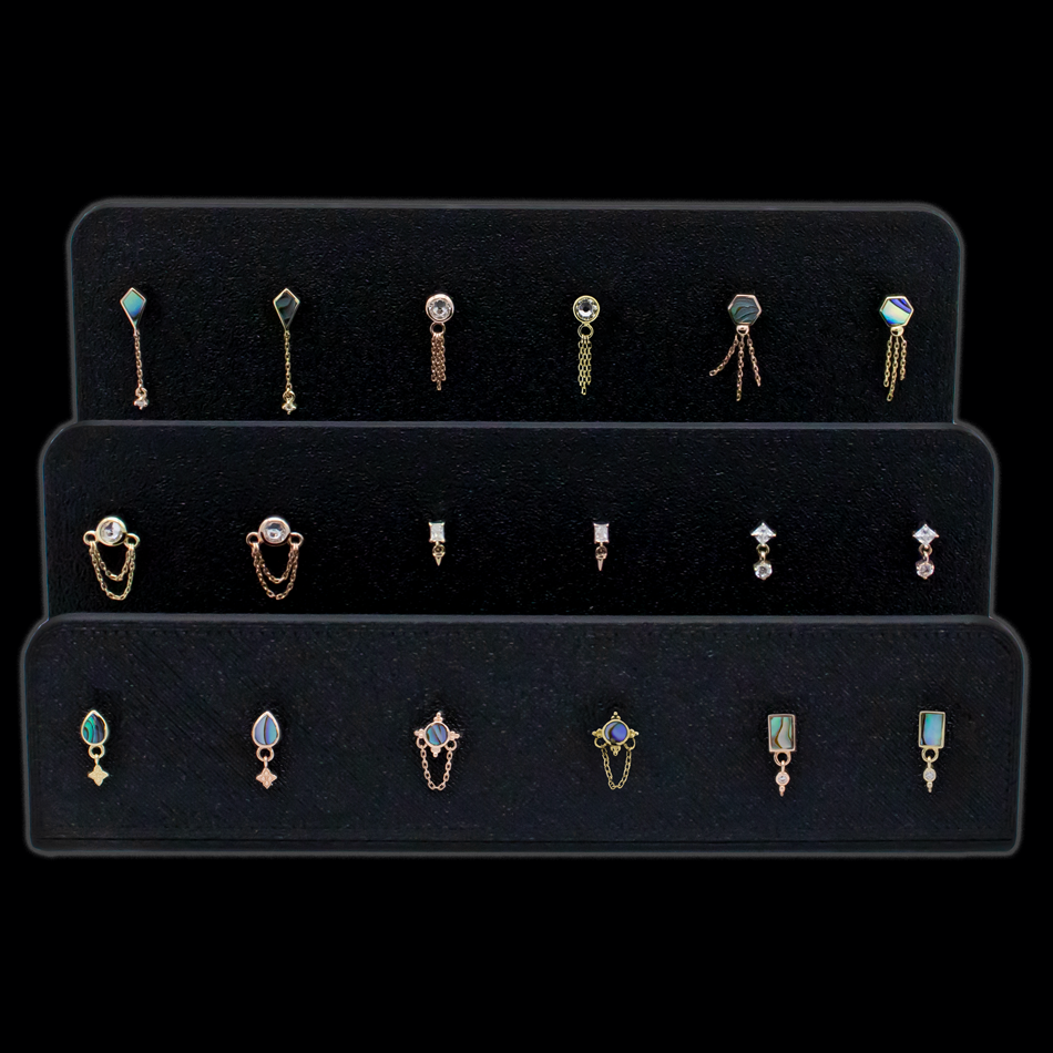 Showcase elegance and innovation with our compact3-Piece L-Bend Display Set, complete with18 pieces of solid 14kt gold threadless ends featuring dangle styles . Each display piece features a sleek, modern angled design with 6 posts to hold threadless ends, measuring 4.6" in length and tiered heights (1.2", 1.6", and 2") for maximum visual impact. Curate your own stunning assortment of threadless dangle and fashion ends—mix dazzling paua shells, bold spikes, and intricate designs to capture attention.