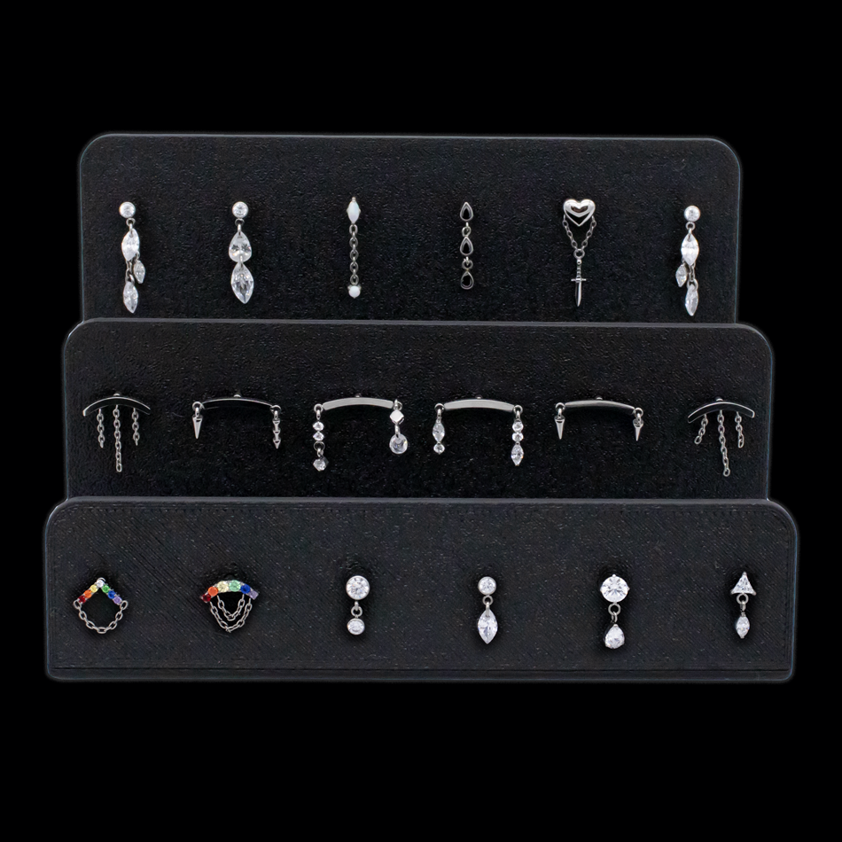 Showcase elegance and innovation with our compact 3-Piece L-Bend Display Set, complete with 18 pieces of ASTM F-136 titanium threadless dangle and hidden helix style ends. Each display piece features a sleek, modern angled design with 6 posts to hold threadless ends, measuring 4.6" in length and tiered heights (1.2", 1.6", and 2") for maximum visual impact. Curate your own stunning assortment of threadless dangle and hidden helix ends—mix dazzling gems, bold spikes, and intricate designs to capture attention.