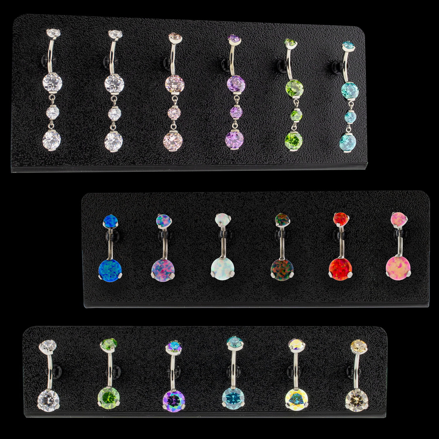 Display Luxury. Spark Curiosity. Sell more with our compact 3 Piece L-Bend Display Set complete with 18 pcs of ASTM F-136 titanium internally threaded curved barbells. Each display piece features a modern angled design with 6 clips and each piece is 4.6" long and has a tiered height (1.2", 1.6" and 2"). Create your own assortment of 14g navel rings and 16g curved barbells and create your own dazzling assortment of gems and opals.