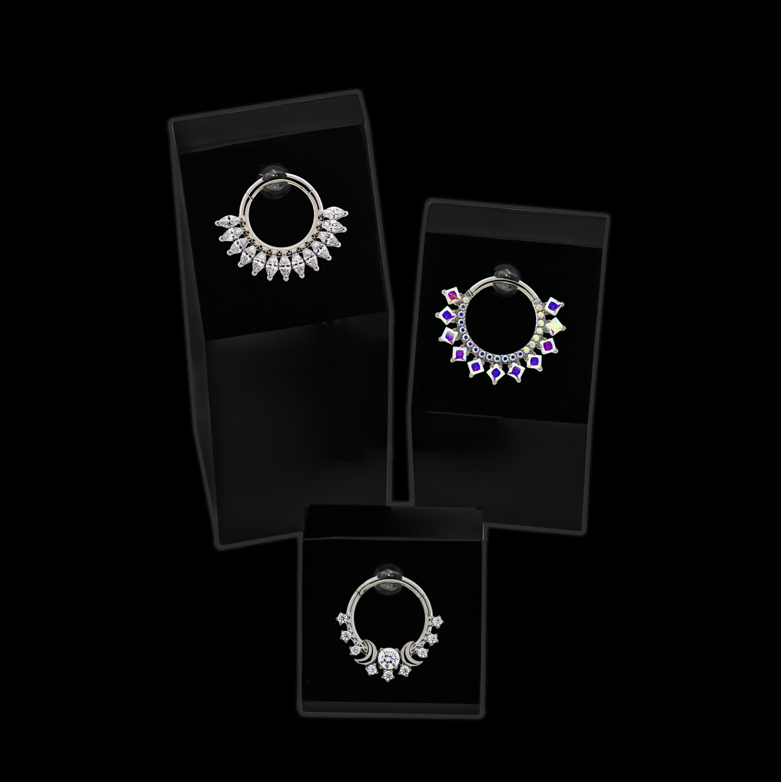 Pair the display with any 3 titanium hinged rings of your choice— crafted in ASTM F-136 titanium with gorgeous, bold details. These scene-stealing styles are perfect for septum or daith piercings, combining standout sparkle with durability and comfort.