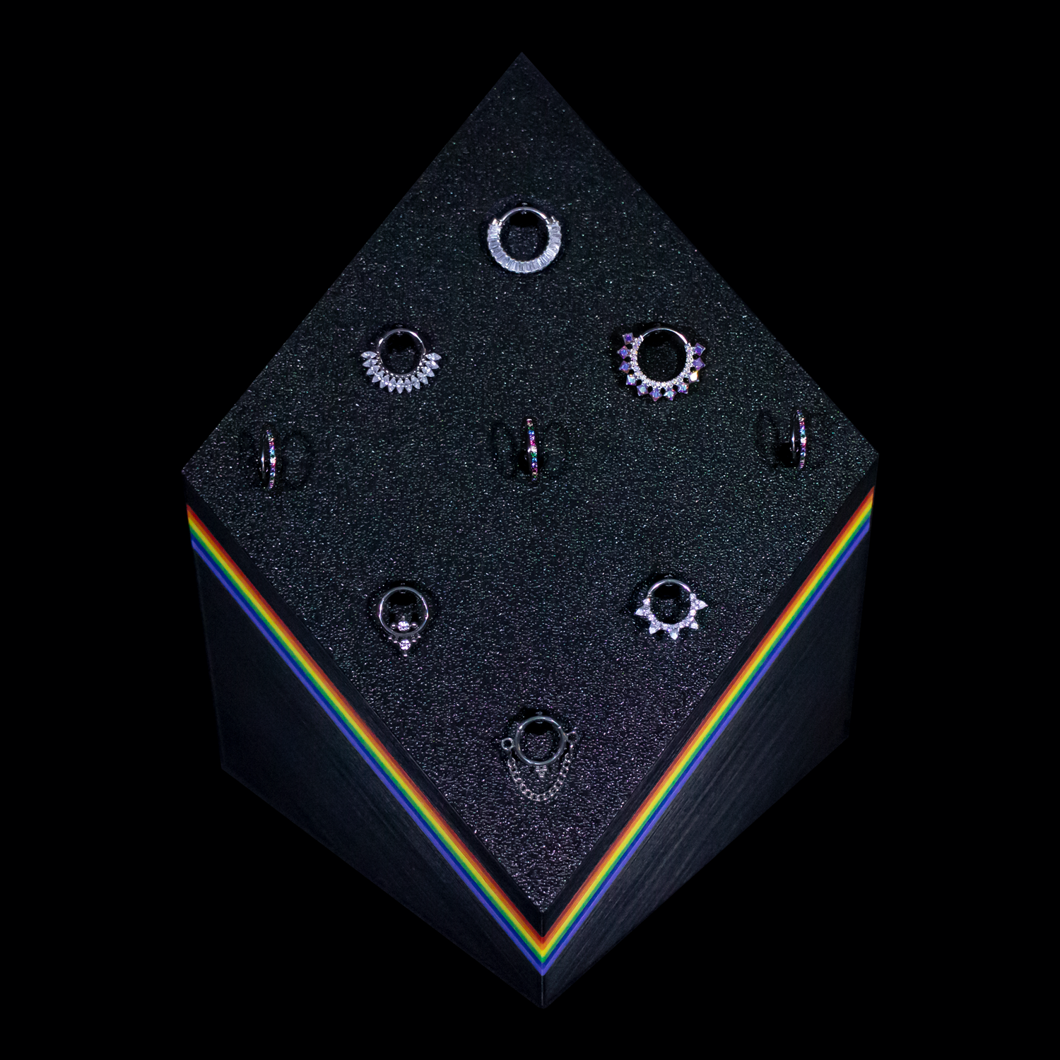 Unleash your boldest self this Pride Month with our newest compact display—now available in striking matte black and kissed with a playful pop of rainbow magic! Designed with 9 versatile clips, this vibrant stand securely holds your favorite clickers, barbells, hinged rings, or segment rings, from 20g to 14g.