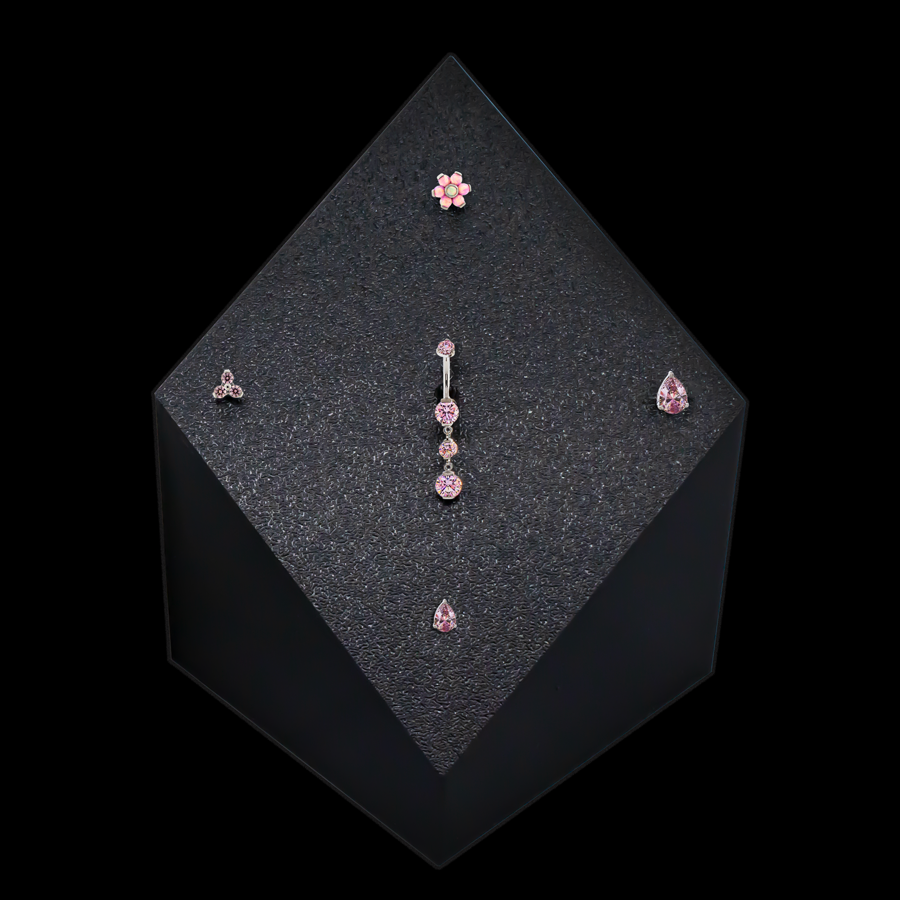 This exclusive kit is designed to hold one navel ring and four threadless ends, giving you the freedom to curate your own one-of-a-kind showcase. Choose from an assortment of pink gems and opals to create a display that is both elegant and empowering. Each piece is presented in a 3D-printed display made in the USA from durable, eco-conscious PLA—crafted as a symbol of strength, resilience, and hope.