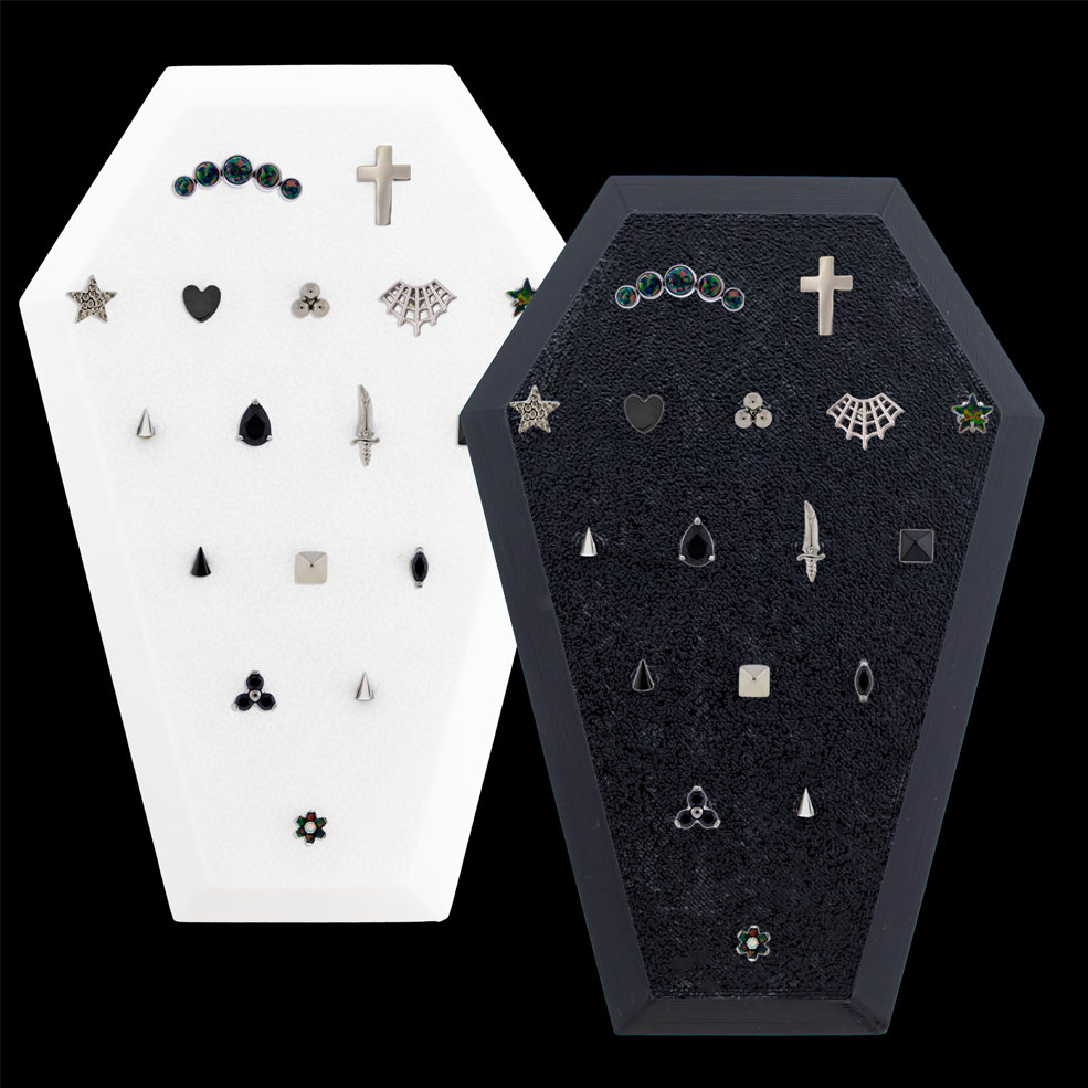For your next spooky holiday, conjure up your most captivating collection of 16g/18g titanium internally threaded ends, nestled perfectly in our limited-edition coffin-shaped display. Made for those who embrace the strange and stylish, this hauntingly sleek showcase is the perfect tomb for your 17 favorite titanium pieces. This eye-catching, compact display is the perfect addition to countertops and jewelry cases—doubling as both a functional showcase and a festive conversation starter that brings a playful touch to your shop’s décor. Display measures 110mm x 75mm X 12mm.