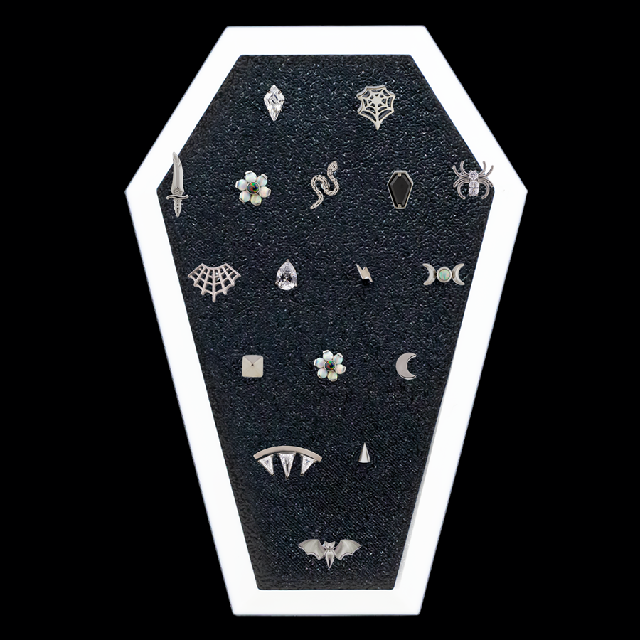 Step into spooky season with a showcase that glows with spectral elegance. Our iconic coffin display emerges anew with a bone chilling white trim, creating a contrast that makes your collection shine in hauntingly beautiful ways.