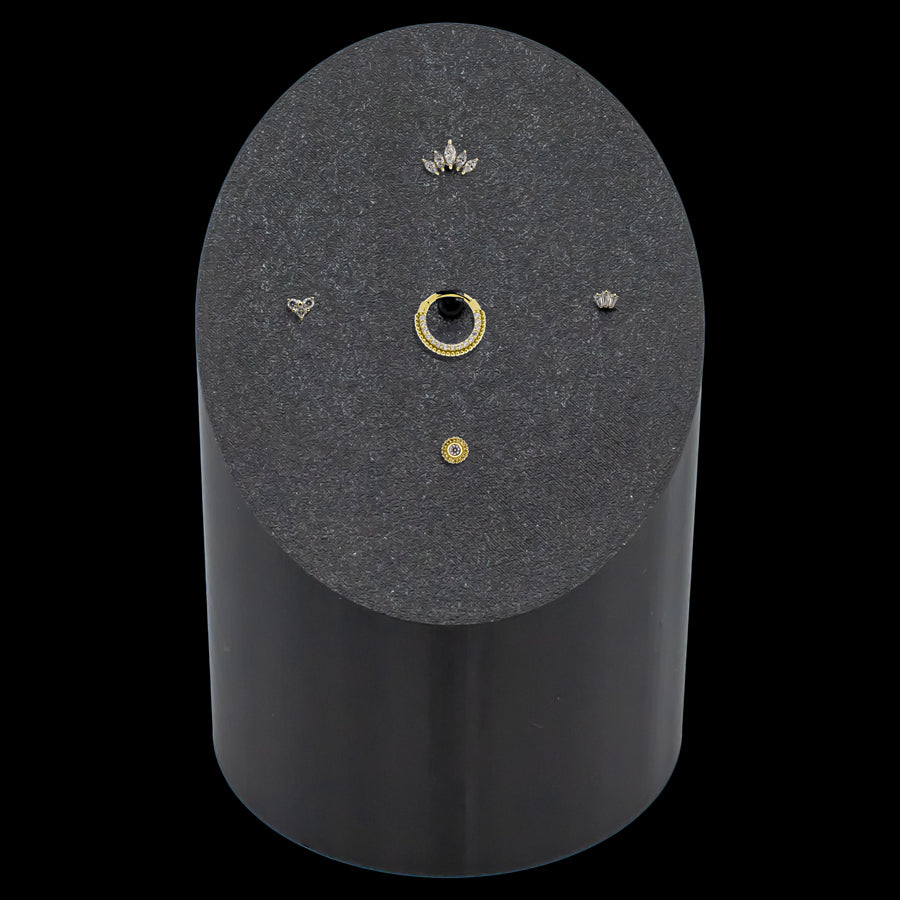 Elevate your counters with our modern Cylinder Jewelry Display Tower, designed to spotlight mini body jewelry collections that help you upsell an entire look. This sleek display features a unique configuration of a center clip and four posts—perfect for presenting a coordinated set of threadless ends alongside a 14kt solid gold hinged ring.