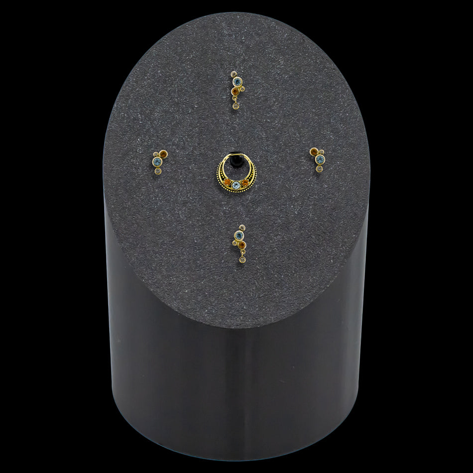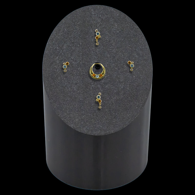 Elevate your counter with the Cylinder Jewelry Display Tower, designed to spotlight a radiant mix of 18kt solid gold body jewelry and natural gemstones in a sleek, space-saving form. Featuring four posts and a center clip, this modern display is ideal for curating a refined assortment of threadless ends and a striking forward-facing hinged ring.