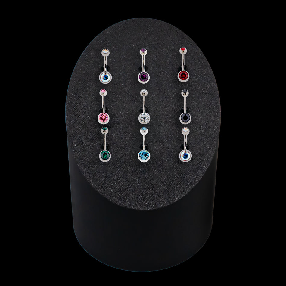 Present your jewelry in style with our sleek Cylinder Display Tower, featuring 9 secure clips for a striking presentation. This compact yet eye-catching tower is designed to hold 9 pieces of jewelry and this kit is designed to help you fill it instantly! Choose you favorite 14g ASTM F-136 titanium internally threaded navel barbells, each adorned with premium double bezel-set crystal gems that captivate from every angle.