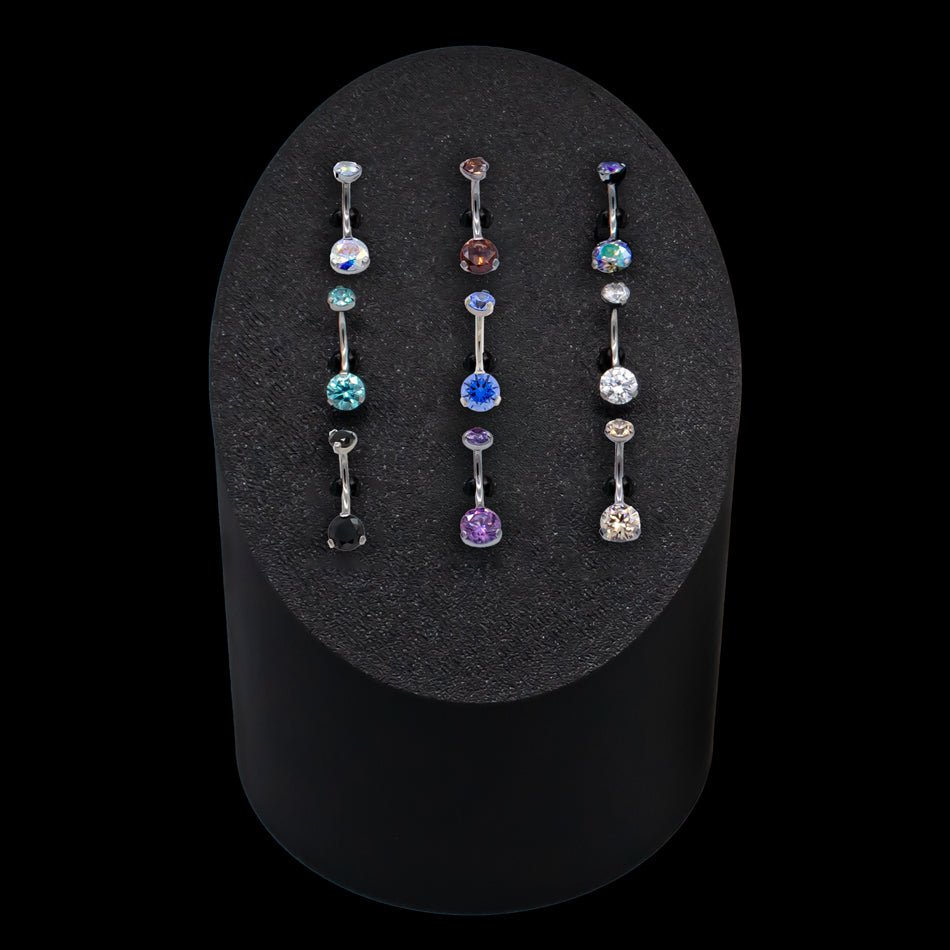 Present your jewelry in style with our sleek Cylinder Display Tower, featuring 9 secure clips for a striking presentation. This compact yet eye-catching tower is designed to hold 9 pieces of jewelry and this kit is designed to help you fill it instantly! Choose you favorite 14g ASTM F-136 titanium internally threaded navel barbells, each adorned with double prong-set premium zirconia gems or synthetic opals that captivate from every angle.