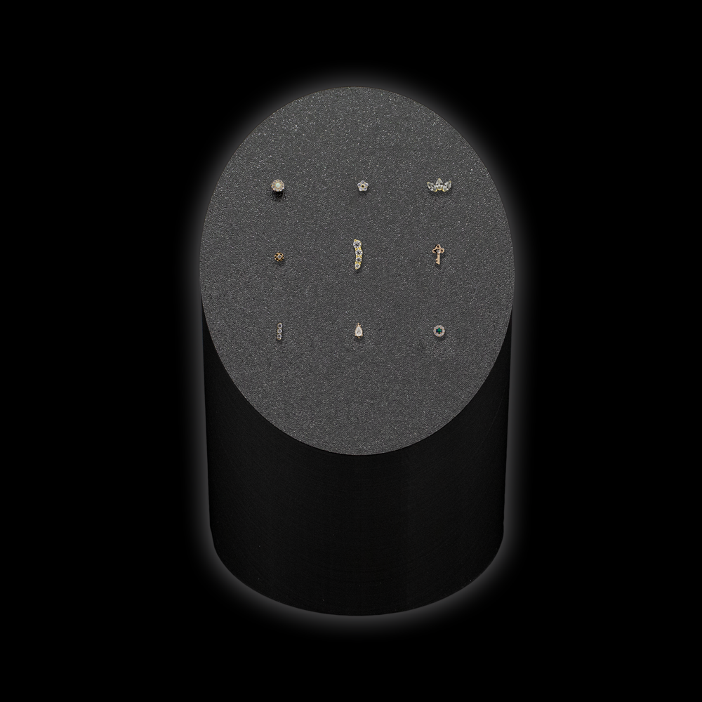 Showcase your 14kt solid gold threadless ends with sleek sophistication. Our all-new cylinder display tower, crafted for premium studios, offers a clean, modern presentation that lets your 14kt threadless collection shine. Available in crisp white or bold black, this studio-ready design brings quiet luxury to your counter or case.