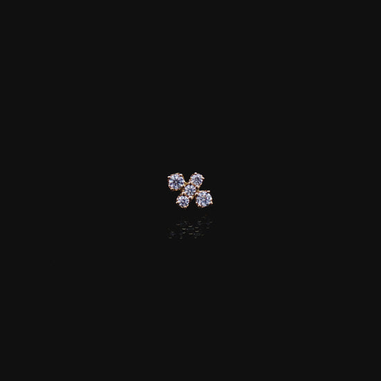 This gold threadless end features a bold cross-inspired design set with white cubic zirconia. The mix of square and round stones creates clean symmetry with eye-catching sparkle. Finished with a titanium threadless pin and compatible with most 18G (1.0mm)–10G (2.5mm) threadless posts.