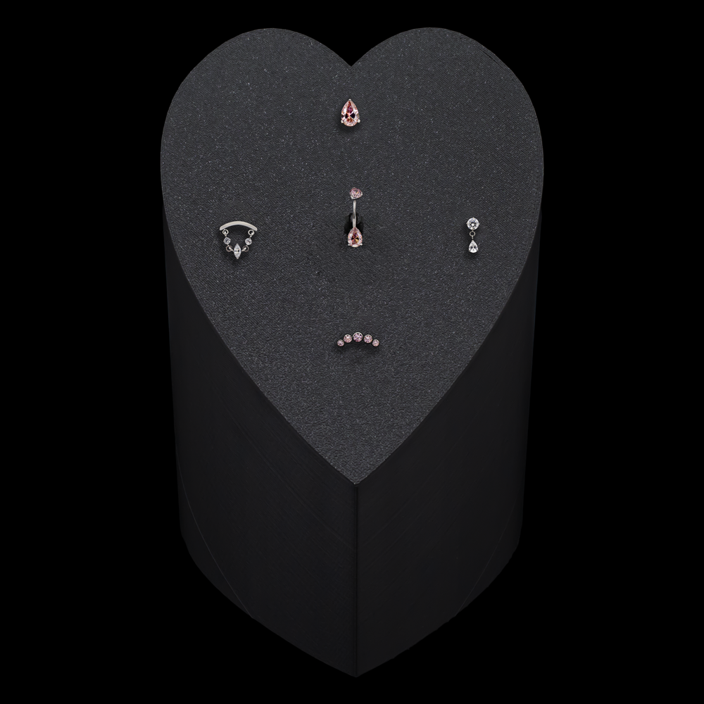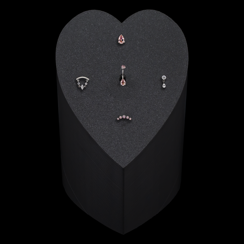 Create a Valentine’s moment your customers will remember with the Heart-Shaped Display Tower—a sculptural, space-efficient design made to elevate your jewelry case and spotlight gifts chosen to last. Refined and visually striking, this display showcases titanium body jewelry in a bold, gem-forward assortment, anchored by an internally threaded navel ring at the center and finished with four threadless ends for a cohesive, eye-catching presentation that invites closer attention.